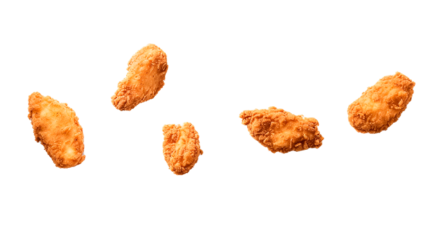 Flying chicken tasty nuggets isolated on transparent or white background.