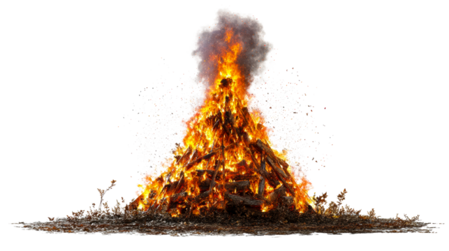 A large bonfire with bright orange and yellow flames burning intensely against a transparent background, symbolizing energy and warmth