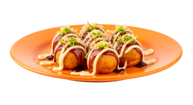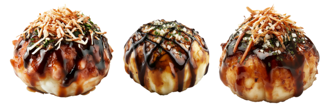 Set of takoyaki octopus balls with bonito flakes and green onions garnish isolated on a white or transparent background