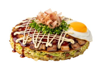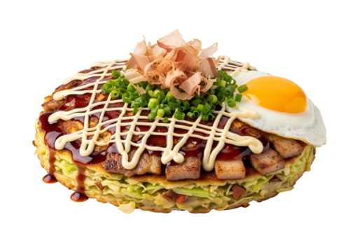 Delicious Okonomiyaki Japanese savory pancake with toppings including egg bacon and green onions