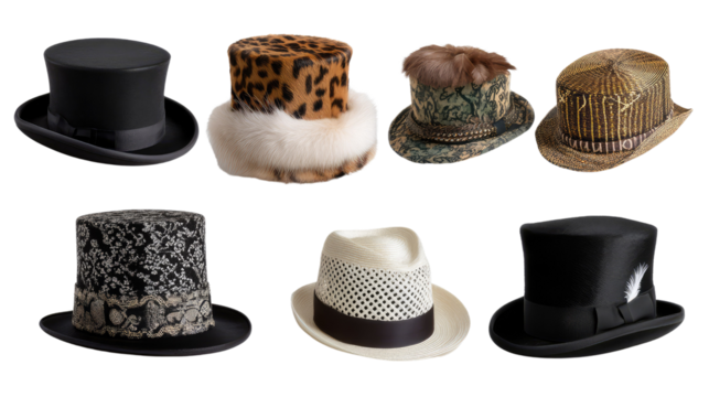 Variety of Stylish Headwear: A diverse collection of hats, each with a unique design, pattern and style, showcasing the elegance and fashion-forward thinking of contemporary attire.