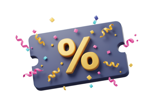 3D Rendered Discount Coupon With Golden Percentage and Confetti
