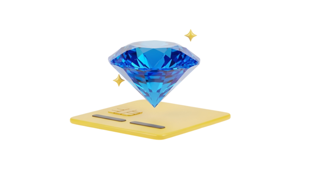 A sparkling blue diamond sits on top of a gold credit card, symbolizing luxury and premium finance
