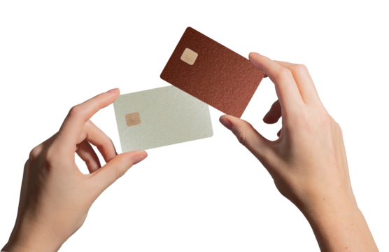 Woman holding two credit cards, comparing options. Dark and light brown, beige plastic cards with chip, showcasing payment, transaction, and cashback. Closeup of hands, wrist, and arm. Isolated on.
