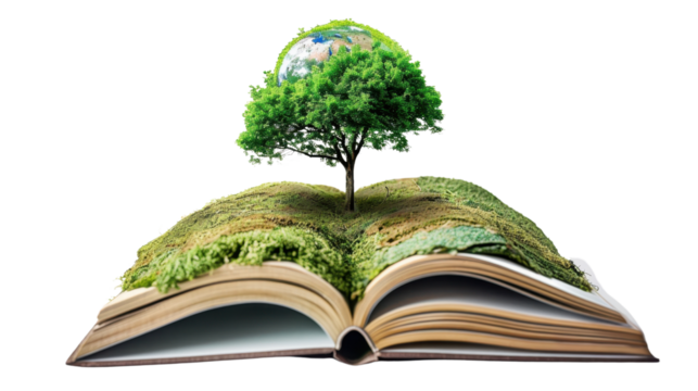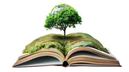 Stylish hipster woman halfway hiding behind green book on transparent background
