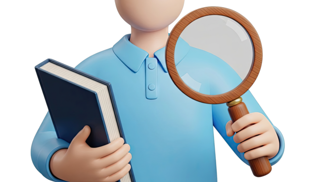 3D character holding a book and magnifying glass