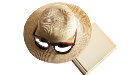 Minimalistic top view of summer straw hat, sunglasses and book, isolated on white, PNG format, professional photography