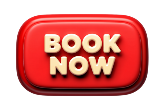 Glossy red book now button with 3d cream colored text isolated on transparent background
