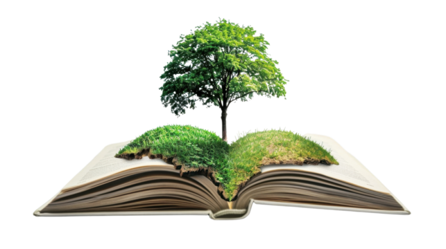 Open book with a miniature tree growing from its pages symbolizes nature and knowledge