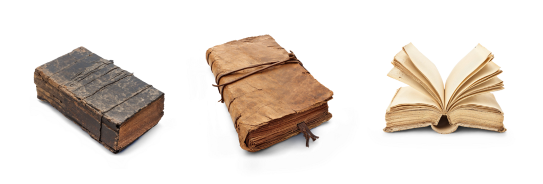 old torn and grunge old book and page paper sheet as empty blank mockup of aged knowledge wisdom and history ancient science, cutout on png transparent background collection