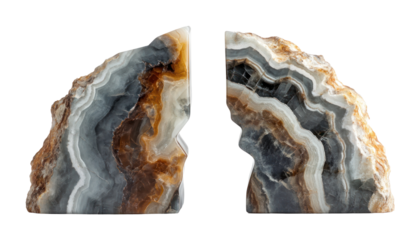 A pair of intricately patterned onyx stone bookends showcasing a natural, elegant design.