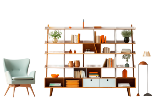 Classic wooden bookshelf with empty shelves, isolated on a transparent background