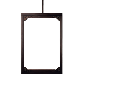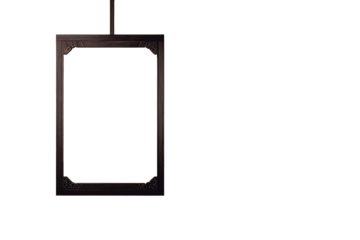 A simple wooden frame hanging on a bookstore wall dark brown or light brown wood empty background inside the frame elegant East Asian aesthetics subtle orient