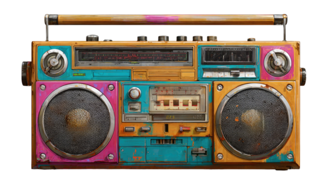 Classic boom box stereo isolated on white background for retro music listening, portable audio, and vintage style