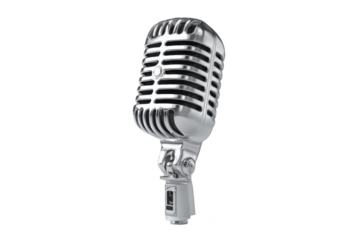 Silver & black microphone with a mesh head and stand against a dark backdrop