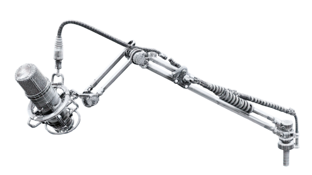 Studio microphone boom arm.  Adjustable metal arm supports a microphone