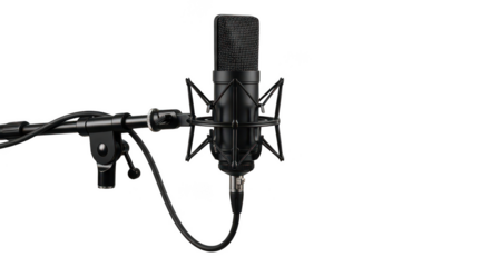 Professional studio microphone on a boom arm against a black background