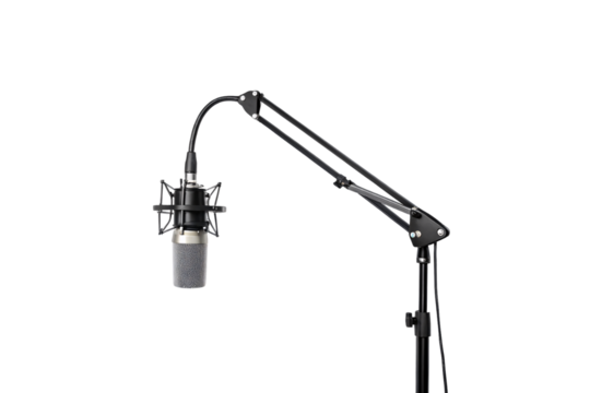 Desktop microphone on an adjustable boom arm stand for podcasting isolated with transparent background