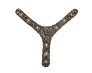 Intricate dot art adorns an aboriginal boomerang in a studio shot offering a detailed perspective