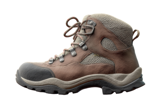 Brown leather hiking boot with red laces and sturdy sole, cut out, stock png, isolated on transparent background