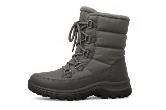 Stylish gray winter boot with laces and a thick sole, perfect for snowy weather, isolated on a transparent background