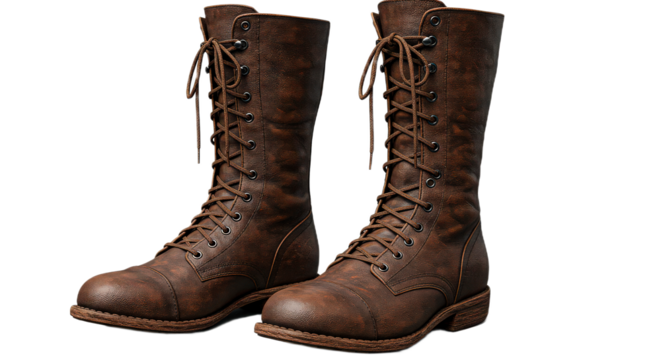 Pair of brown leather combat boots isolated on transparent background, offering a blend of style and durability