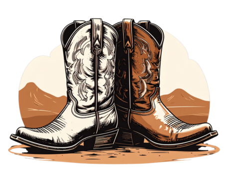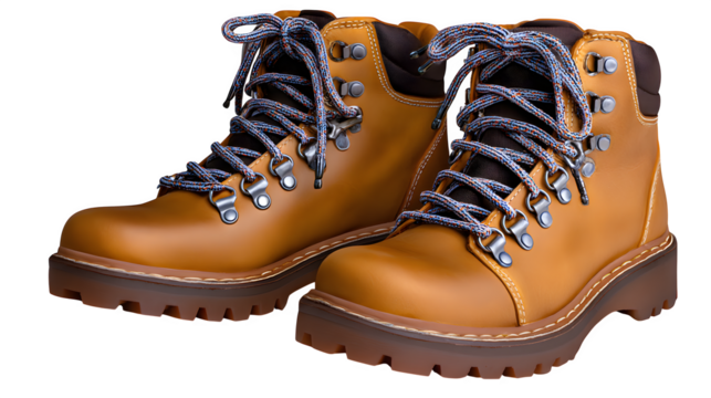 Pair of rugged men? hiking boots in tan leather, side and 3/4 views, isolated on white,
