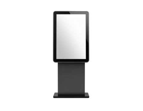 A sleek digital kiosk featuring a large touchscreen display mounted on a sturdy stand, ideal for interactive information sharing.