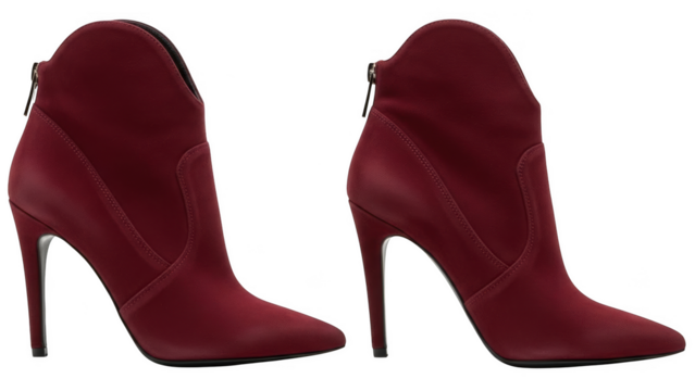 Isolated, shiny stiletto heel ankle boot, crimson red color, high-fashion footwear shoe