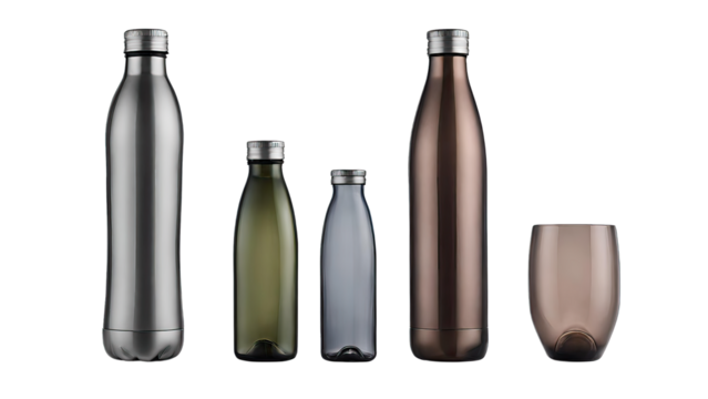 isolated kitchen utensil, bowl, knife, fork and spoon, bottle and glasses