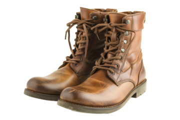Worn leather hiking boots, rugged and broken in, symbolizing adventure and perseverance on isolated white background.