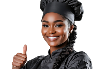 Smiling female chef wearing a black uniform and hat, giving a thumbs up in a positive and enthusiastic kitchen environment, promoting culinary success and joy
