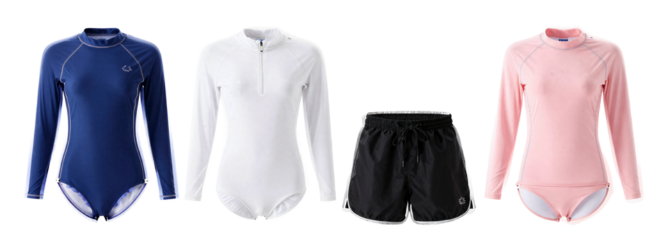 Photograph of three long-sleeve swim leotards and black swim shorts. From left to right: blue leotard, white leotard, black shorts, pink leotard.