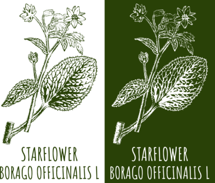 Drawings STARFLOWER. Hand drawn illustration. Latin name BORAGO OFFICINALIS L.
