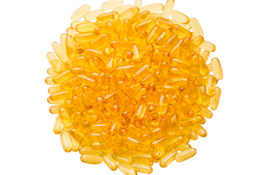 Close up of food supplement oil filled capsules suitable for: fish oil, omega ,evening primrose, borage oil, flax seeds oil, vitamin on transparent png
