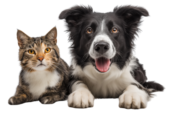 Tabby cat and Border Collie dog lying down together on black isolated on a transparent background feline