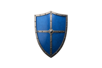 Medieval blue shield with metal cross reinforcement and riveted border showing classic defensive weapon construction, isolated on a transparent background