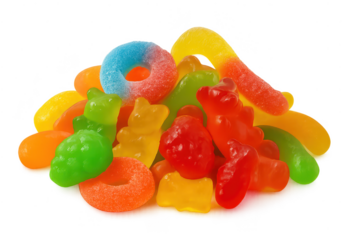 Pile of chewy colorful bear-shaped candies in various flavors, stacked and arranged together in a playful way, isolated on transparent background