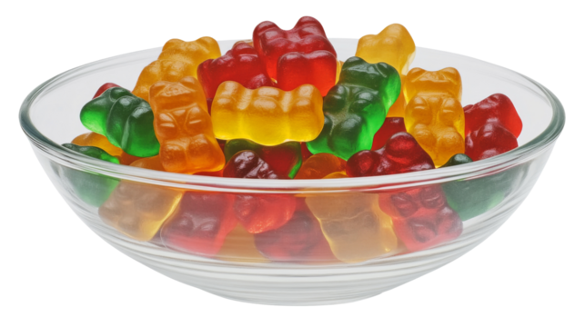 Glass bowl overflowing with colorful gummy bears on transparent background
