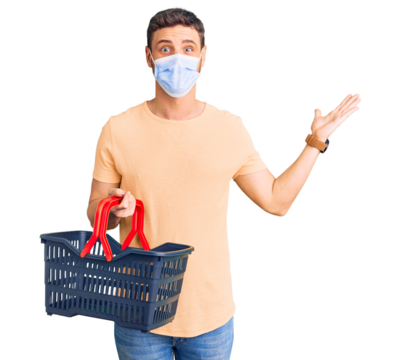 Handsome young man with bear wearing shopping basket and medical mask celebrating victory with happy smile and winner expression with raised hands