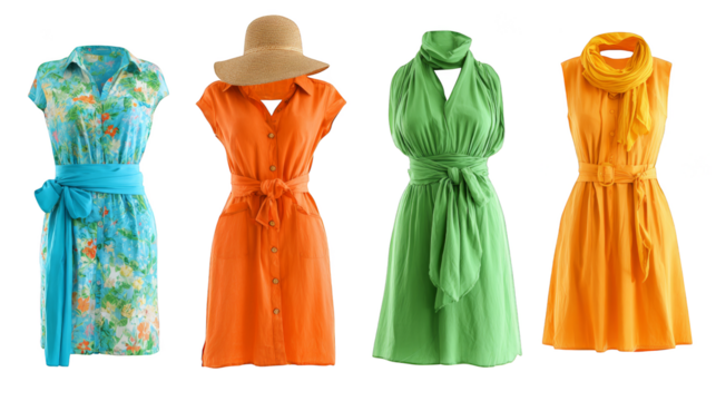 A vibrant collection of four elegant dresses each showcasing a unique and beautiful color palette displayed side by side in a well lit studio setting for a fashion presentation.