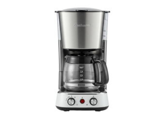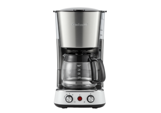 Premium modern electric drip coffee maker, stainless steel vertical panels, white housing, clear borosilicate glass carafe, chrome heating element, isolated on transparent. Commercial product