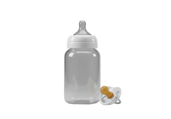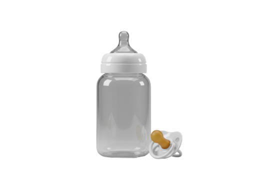 Premium clear borosilicate glass baby bottle with white silicone nipple, white pacifier beside it, isolated on transparent, 45-degree angle. Concept of modern baby essentials