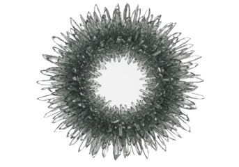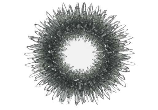 hyper-realistic 3d render of sharp borosilicate crystal shards forming a frozen toroidal explosion on a transparent studio background with hard lighting, defining central copy space, concept of