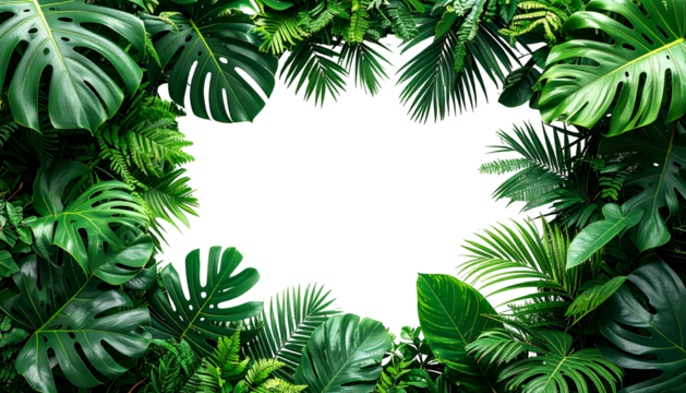 A dense frame of lush tropical leaves surrounds a black void, vibrant green hues dominate