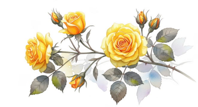 Vibrant yellow roses branch botanical floral arrangement decorative art transparent background black background