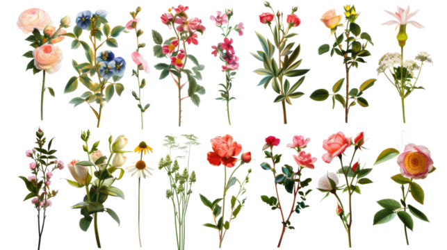 Artistic floral and botanical arrangement with transparent background