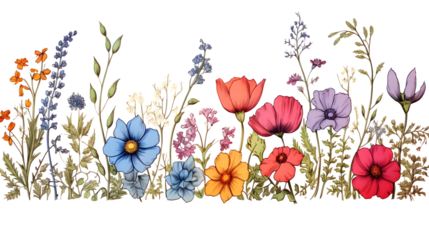 A row of colorful flowers with a white background