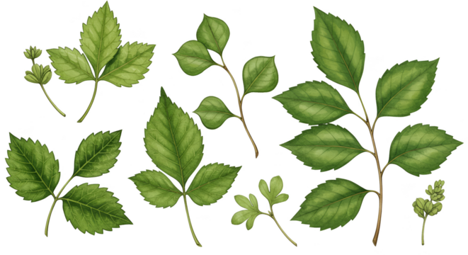 Transparent background botanical illustration with serrated leaves