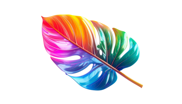 Vibrant, stylized monstera leaf, rainbow gradient, isolated on black background